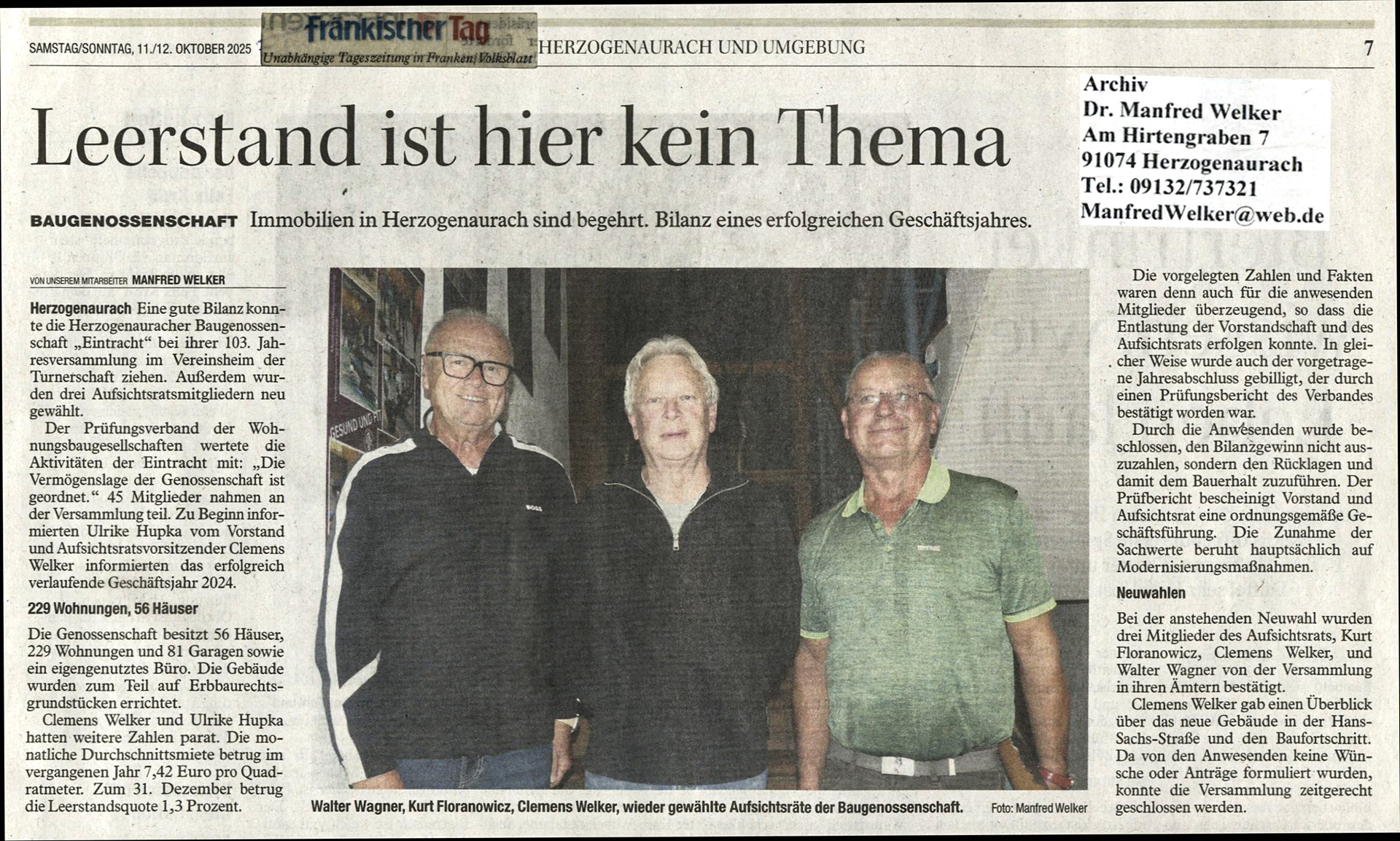 Auf unseren ordentlichen Mitgliederversammlung am Montag, den 29.09.2025 wurden die Aufsichtsräte Walter Wagner, Kurt Floranowicz und Clemens Welker in ihren Ämtern bestätigt und wieder gewählt.