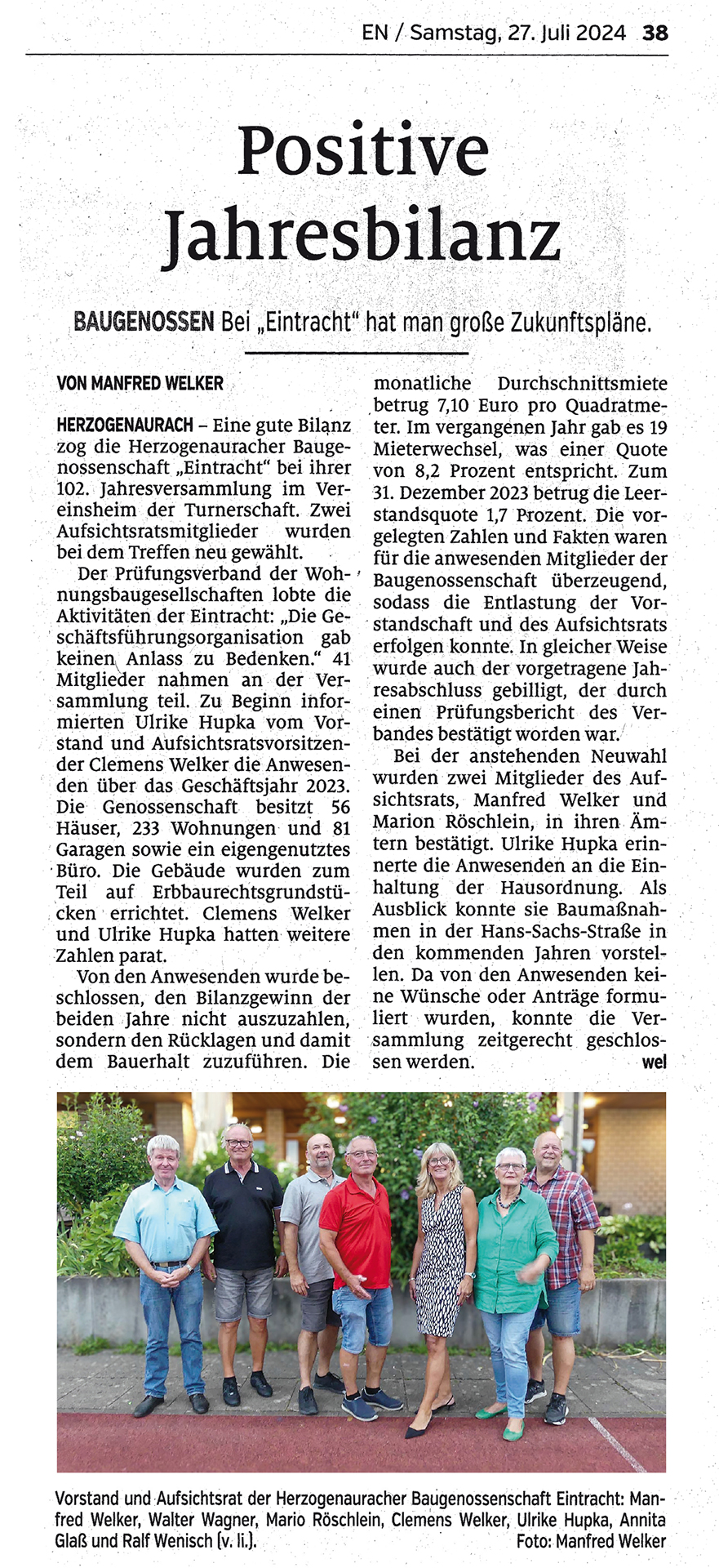 Neue Satzung der Baugenossenschaft Entracht eG vom 16. November 2021 erhältlich